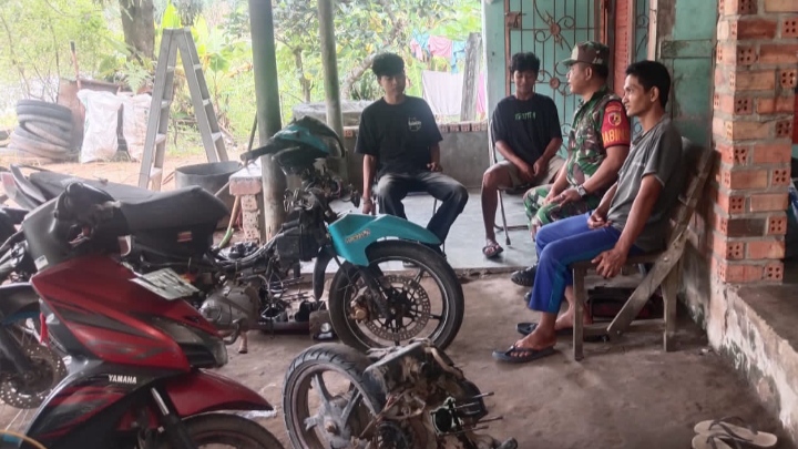Sertu Efendi, Babinsa Koramil 415-03/Muara Tembesi Kodim 0415/Jambi, melakukan Komsos di bengkel milik warga Desa Pelayangan, Kecamatan Muara Tembesi, Kamis (18/02/2026). Dalam kegiatan ini, ia berdialog santai sambil mendengarkan informasi dan perkembangan situasi di lingkungan sekitar.