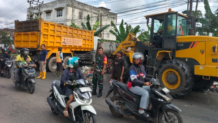 JAMBI SELATAN, SRIWIJAYADAILY — Babinsa Kelurahan Paal Merah Koramil 415-10/Jambi Selatan Kodim 0415/Jambi, Pelda Heriyanto, memantau kegiatan pembersihan sampah di Jalan AR Saleh, RT 10, Kelurahan Paal Merah, Kota Jambi, Kamis, 15 Januari 2026. Kegiatan ini dilakukan sebagai bagian dari upaya mendorong kepedulian warga terhadap kebersihan lingkungan.