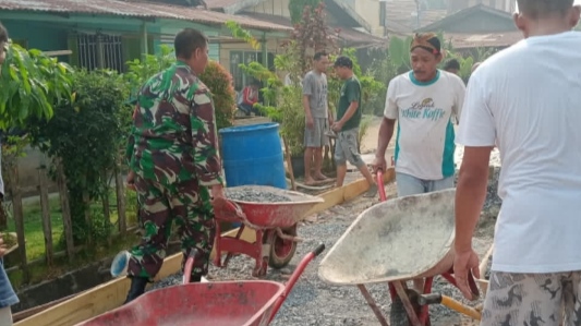 Jambi Selatan — Dalam upaya mendukung peningkatan infrastruktur lingkungan dan memperlancar aktivitas warga, Babinsa Kelurahan Wijayapura Koramil 415-10/Jambi Selatan Kodim 0415/Jambi, Serka Miskaryanto, turut serta dalam kegiatan gotong royong pengecoran jalan lingkungan bersama warga RT 05.
