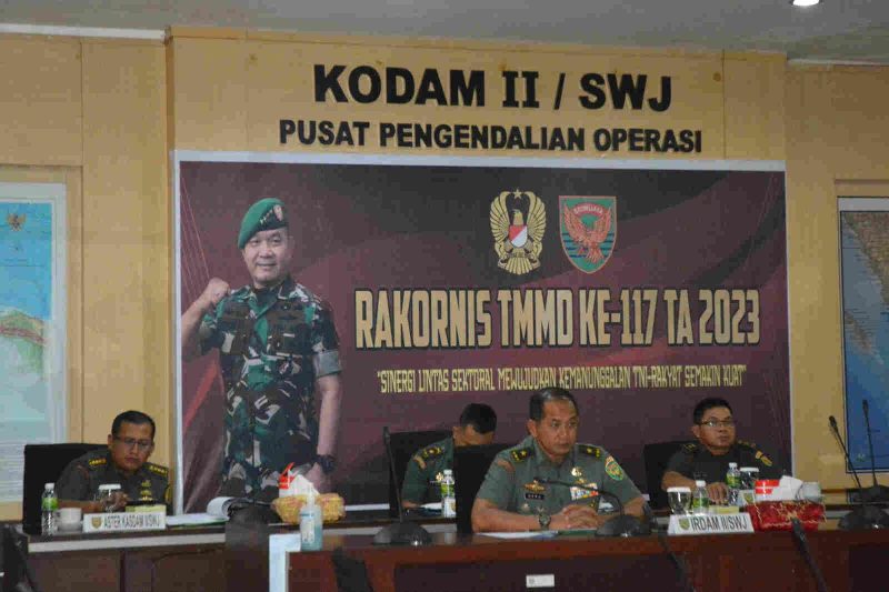 SRIWIJAYADAILY.CO.ID – Inspektur Kodam (Irdam) II/Sriwijaya, Brigjen TNI Heru Setio Paripurnawan, M.D.A. M.S.S., didampingi Aster Kasdam II/Swj, Pabandya Komsos Sterdam II/Swj dan Kasi Medtak Pendam II/Swj, mengikuti kegiatan Rapat Koordinasi Teknis (Rakornis) TNI Manunggal Membangun Desa (TMMD) Ke-117 TA. 2023. Rakornis TMMD ini berlangsung melalui Video Conference (Vicon) bertempat di Ruang Rapat Puskodalopsdam Makodam II/Swj Palembang, Selasa (04/07/2023).