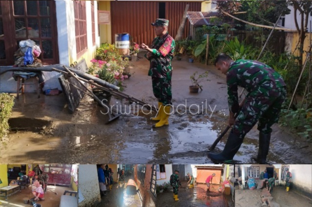 Tampak Danramil dan Babinsa bersama warga masyarakat gotong royong membersihkan rumah-rumah warga yang terdampak, jalan dan saluran air dari tumpukan lumpur akibat banjir semalam.