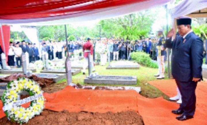 Prosesi pemakaman berlangsung khidmat dengan tata upacara militer. Peti jenazah yang diselimuti bendera Merah Putih diusung prajurit TNI menuju liang lahad. Presiden Prabowo berjalan di belakang peti jenazah sebagai bentuk penghormatan terakhir.