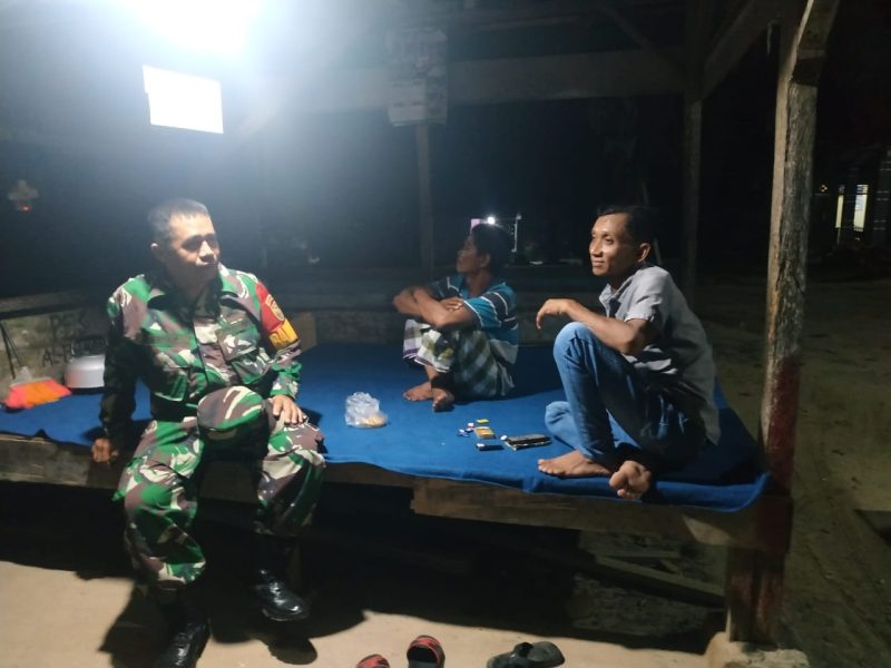 Sertu erfan menyampaikan pesan-pesan kamtibmas kepada warga yang melaksanakan kegiatan ronda di Poskamling RT. 05 desa Panca Bhakti Kecamatan Sungai Bahar Kabupaten Muaro Jambi .