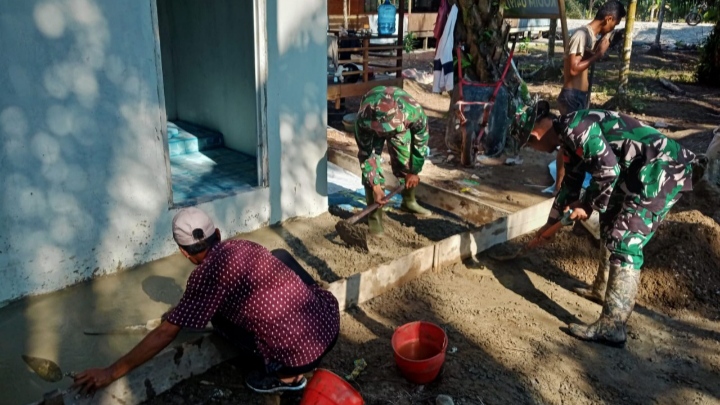 Kegiatan berlangsung sejak pagi hari. Tampak anggota Satgas dengan penuh semangat mengaduk semen, memasang papan cetakan, hingga menuangkan adonan beton ke area teras. Warga turut ambil bagian menyiapkan material bangunan dan menjaga kebersihan lingkungan sekitar.