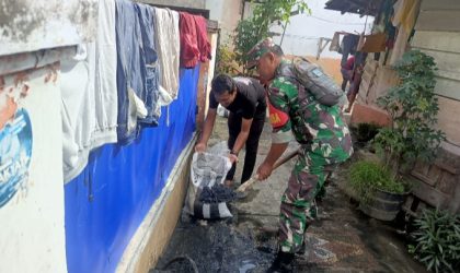 Jambi — Babinsa Koramil 415-12/Pasar Kodim 0415/Jambi, Serka Dwi Suprapto, bersama warga menggelar gotong royong membersihkan…