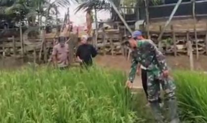 Batanghari — Babinsa Koramil 415-02/Mersam Kodim 0415/Jambi, Serka Sahardi, mendampingi petani sekaligus memantau pertumbuhan padi di…