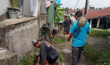 Jambi — Babinsa Kelurahan Cempaka Putih, Serka Ilham, mengikuti kegiatan gotong royong bersama warga di Jalan…