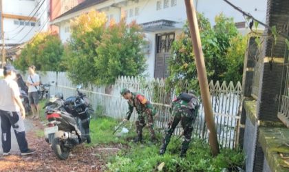 JAMBI — Babinsa Koramil 415-12/Pasar Kodim 0415/Jambi bersama pihak kelurahan mengajak warga melaksanakan gotong royong di…