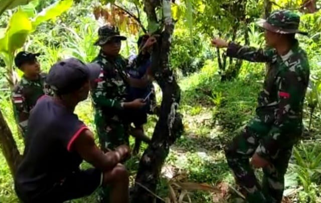 Tampak Prajurit TNI Satgas Yonif 143/TWEJ mengajak masyarakat untuk meremajakan kembali tanamanya menggunakan teknik grafting/sambung pucuk dengan memanfaatkan tunas dipangkal batang sebagai Sadling dengan varietas terbaik yang ada di kebun sebagai Entres, sehingga tidak perlu membongkar dan mengganti tanaman baru.